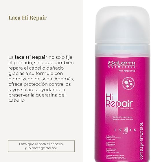 Laca Hi Repair es una laca que repara el cabello y lo protege del sol, además de fijar el peinado. Su fórmula con hidrolizado de seda, rellena de proteínas las zonas dañadas, reparando el tallo capilar. La laca Hi Repair crea un film sobre el cabello para una mayor duración del peinado así como lo aisla de la humedad.