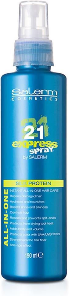 Salerm 21 Express es una mascarilla ligera sin aclarado en spray manual ideal para todo tipo de cabellos, especialmente los más tratados y deshidratados. Su fórmula todo en uno hidrata el cabello y reduce la formación de puntas abiertas. Contiene protección solar para un cabello más cuidado.
